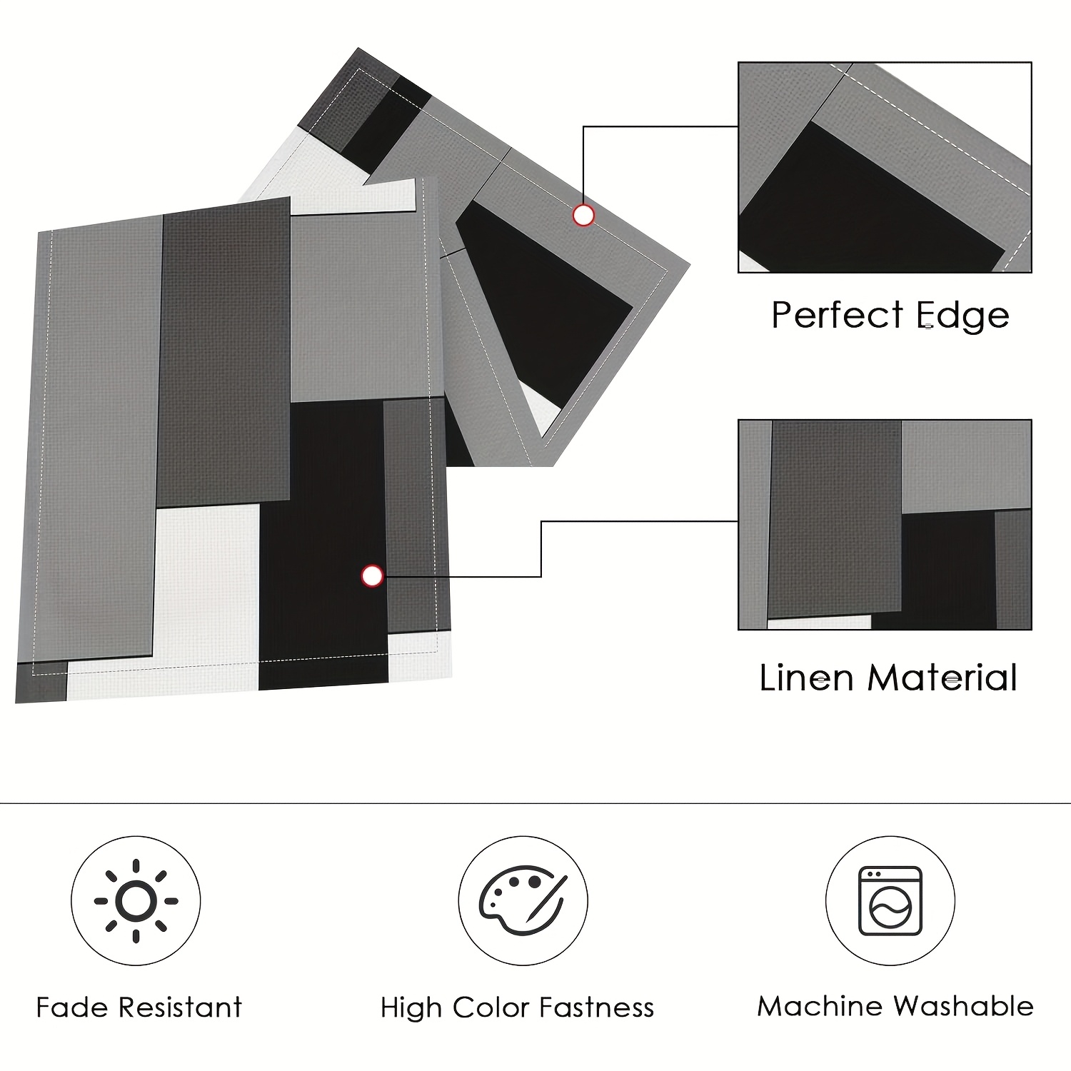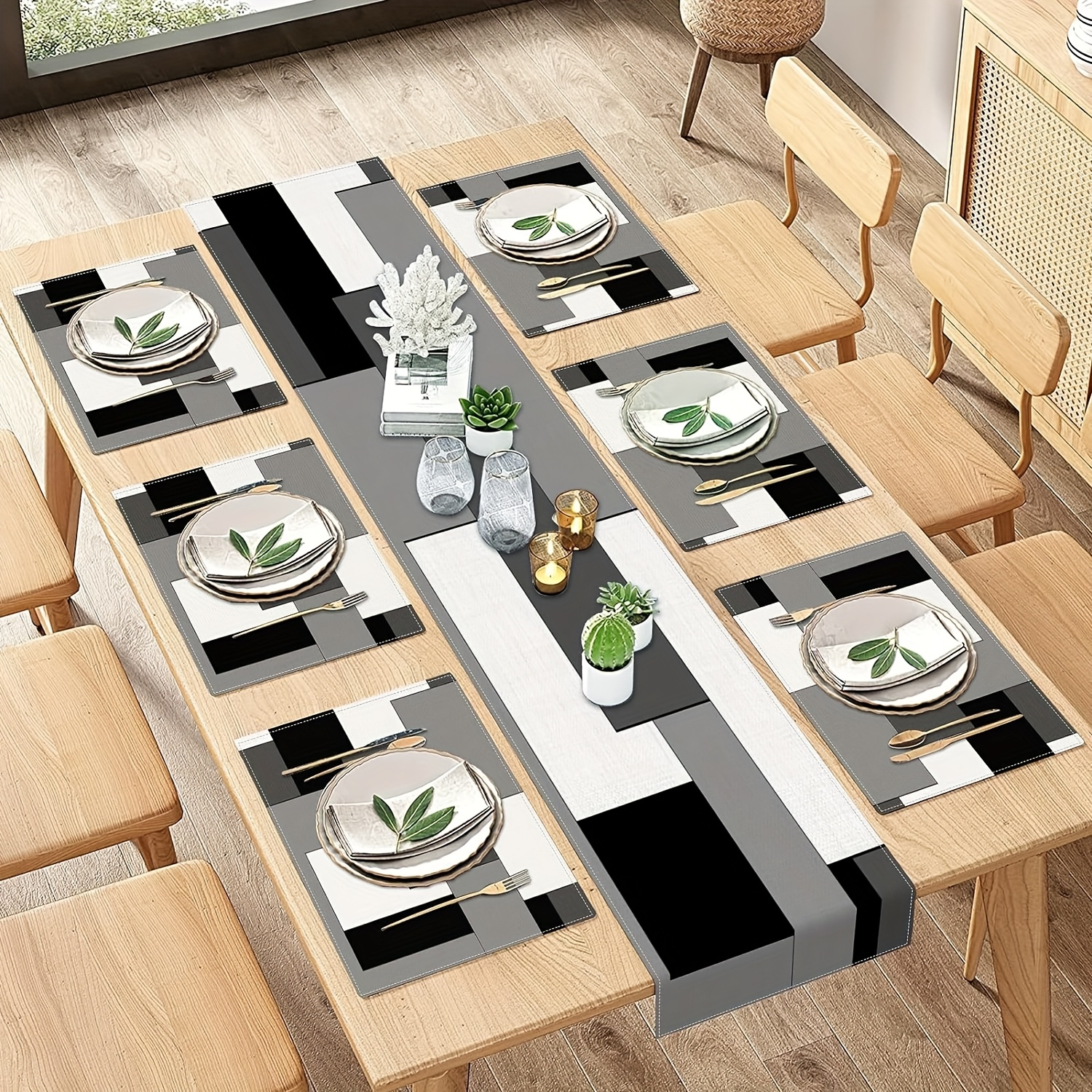 A Set of Geometric Tablecloth And Placemats, Featuring Abstract Art in White, Black, And Gray, Suitable for Everyday Dining Decor